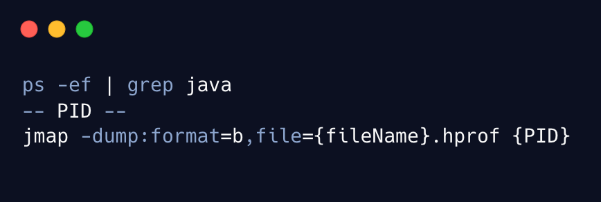 첫 번째 할 일은 현재 서비스중인 서버의 힙 덤프 파일을 만드는 것이다. JDK 에서 제공해주는 jmap 을 활용하면 되는데, 현재 서비스중인 프로세스의 ID (PID) 를 확인하고 해당 PID를 jmap 을 통해 파일로 만들면 된다. 그렇게 만들어진 파일은 '.hprof' 확장자를 가진다. 해당 파일을 로컬 PC로 가져온 후, 해당 파일은 VisualVM을 통해 GUI 로 손쉽게 확인할 수 있다.