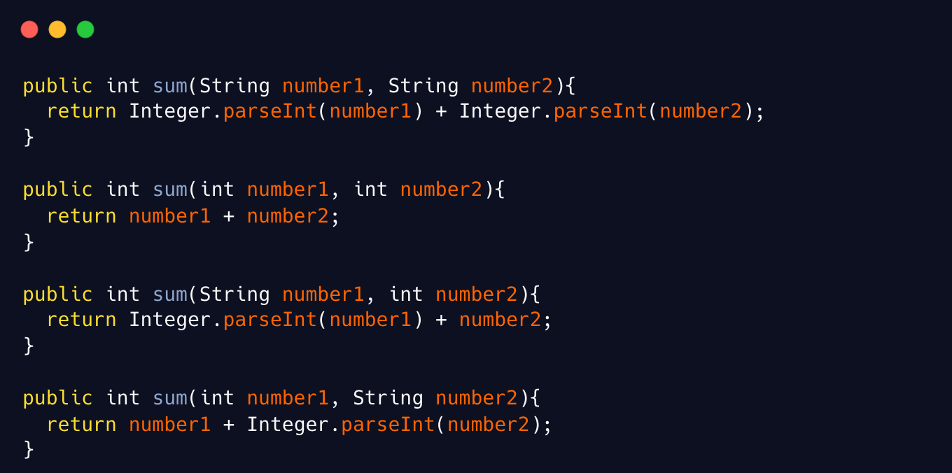 - 같은 클래스에 위치한 메소드의 이름이 같다.