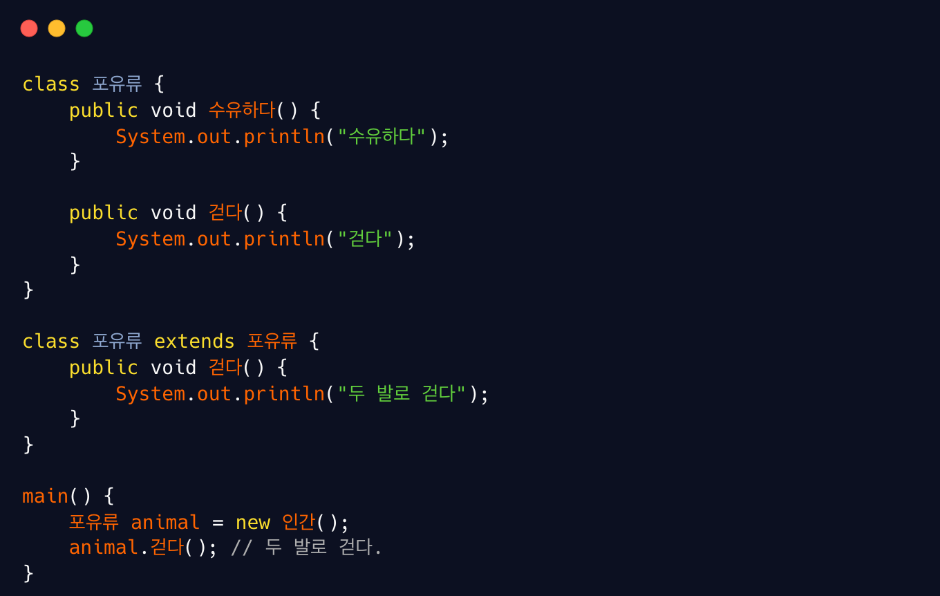 상위 클래스(부모 클래스)의 메소드와 동일한 시그니처의 메소드를 하위 클래스(자식 클래스)에서 구현한 것을 얘기한다. 이렇게 다양한 메서드가 있을 때 실제 생성된 객체에 구현된 메소드를 호출한다.