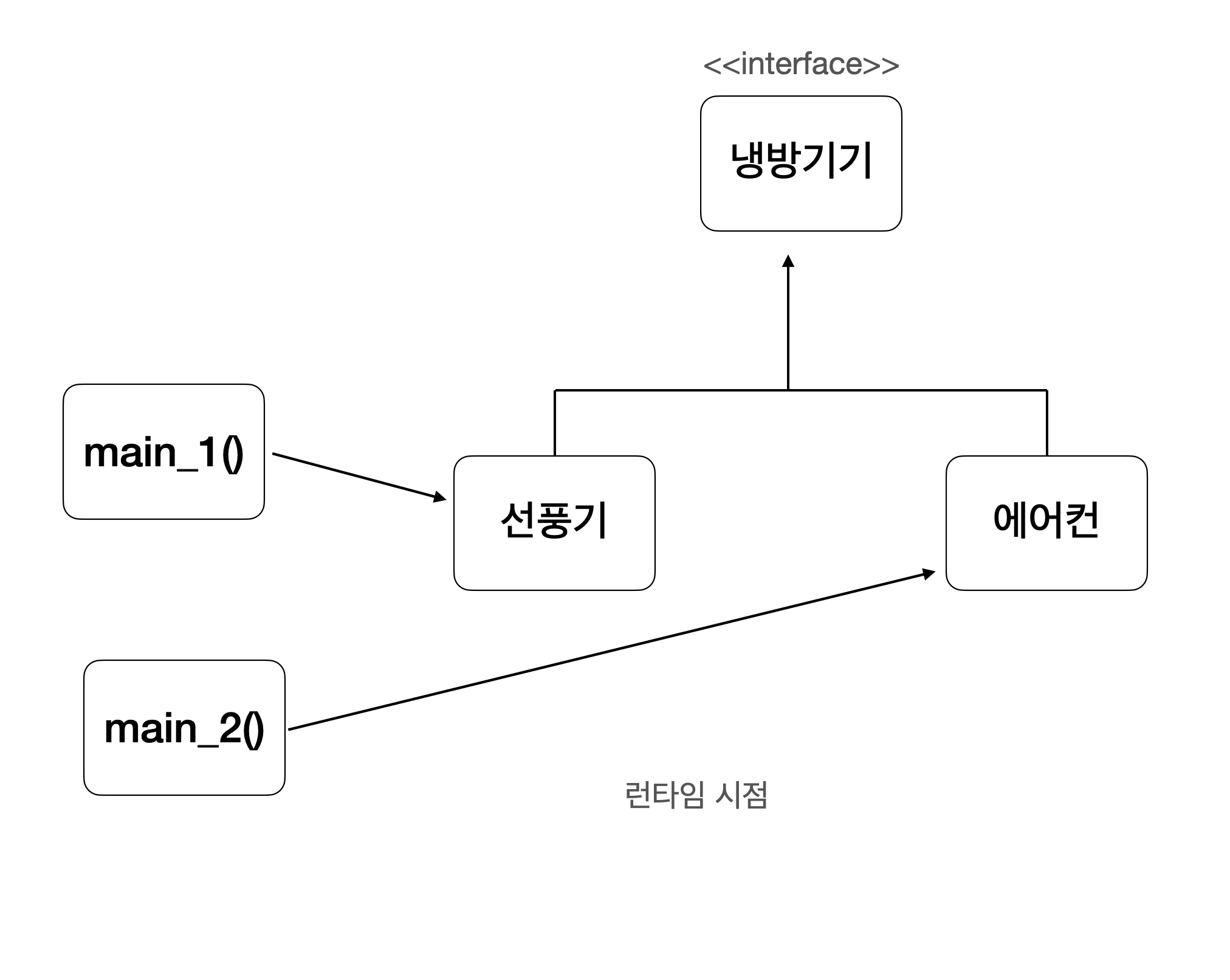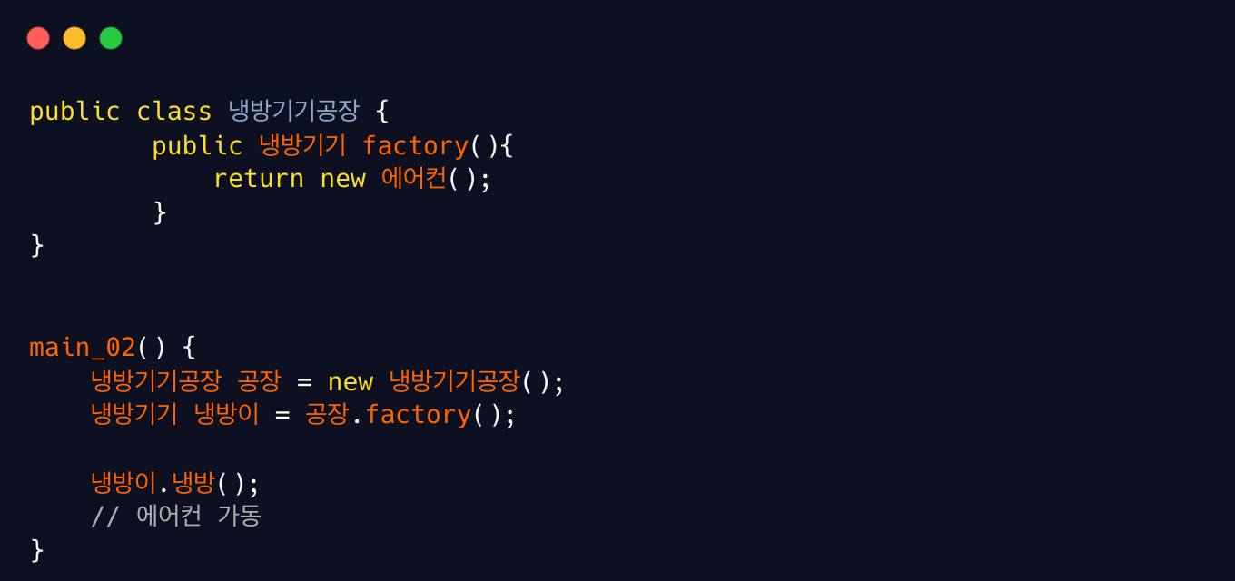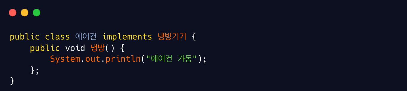 위 코드를 다시보면 main() 은 컴파일 시점에는 냉방기기의 실제 객체가 에어컨인지, 선풍기인지 알 수는 없었던 상황이다. 실제로 ‘냉방이’가 호출한 ‘냉방()’ 메서드가 결정된 것은 런타임 단계에서다. 이와 같이 실제 인스턴스가 런타임 단계에서 결정되는 것을 동적 바인딩 이라고 하고, 메서드의 경우 동적 디스패치 라고 한다.