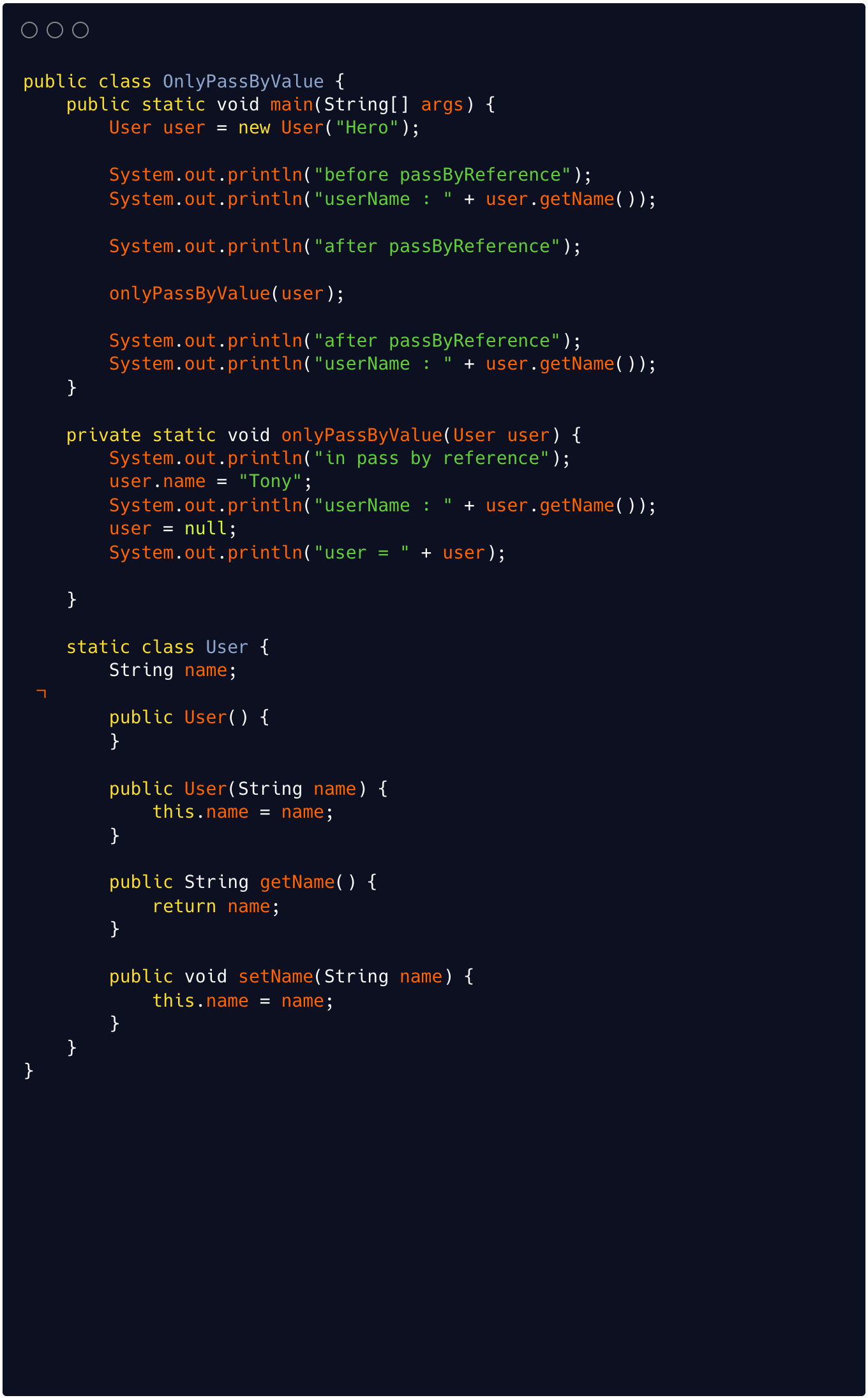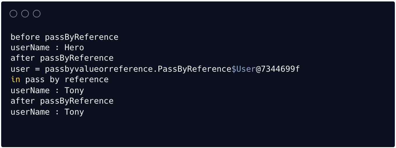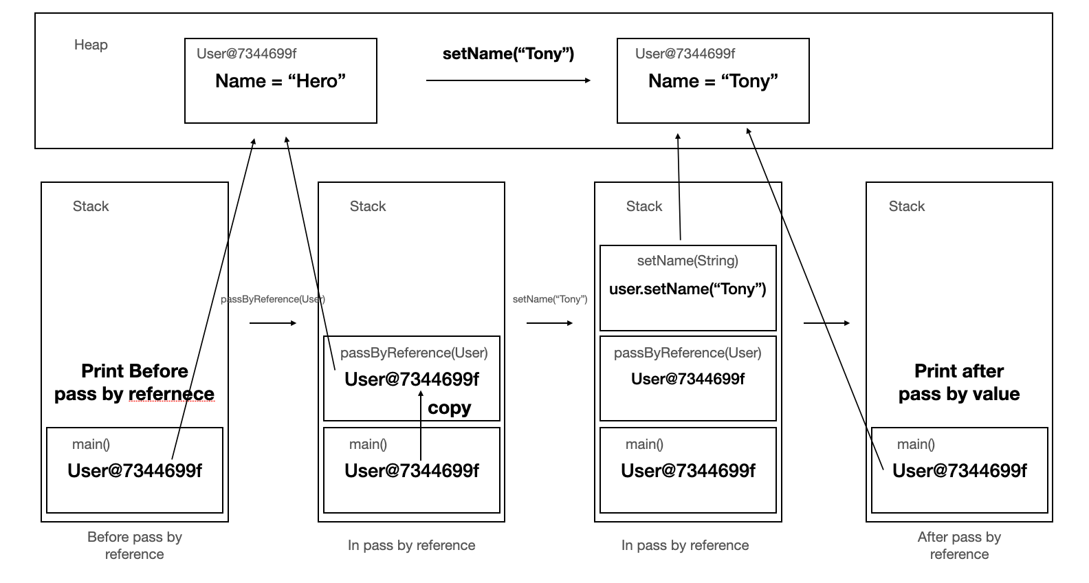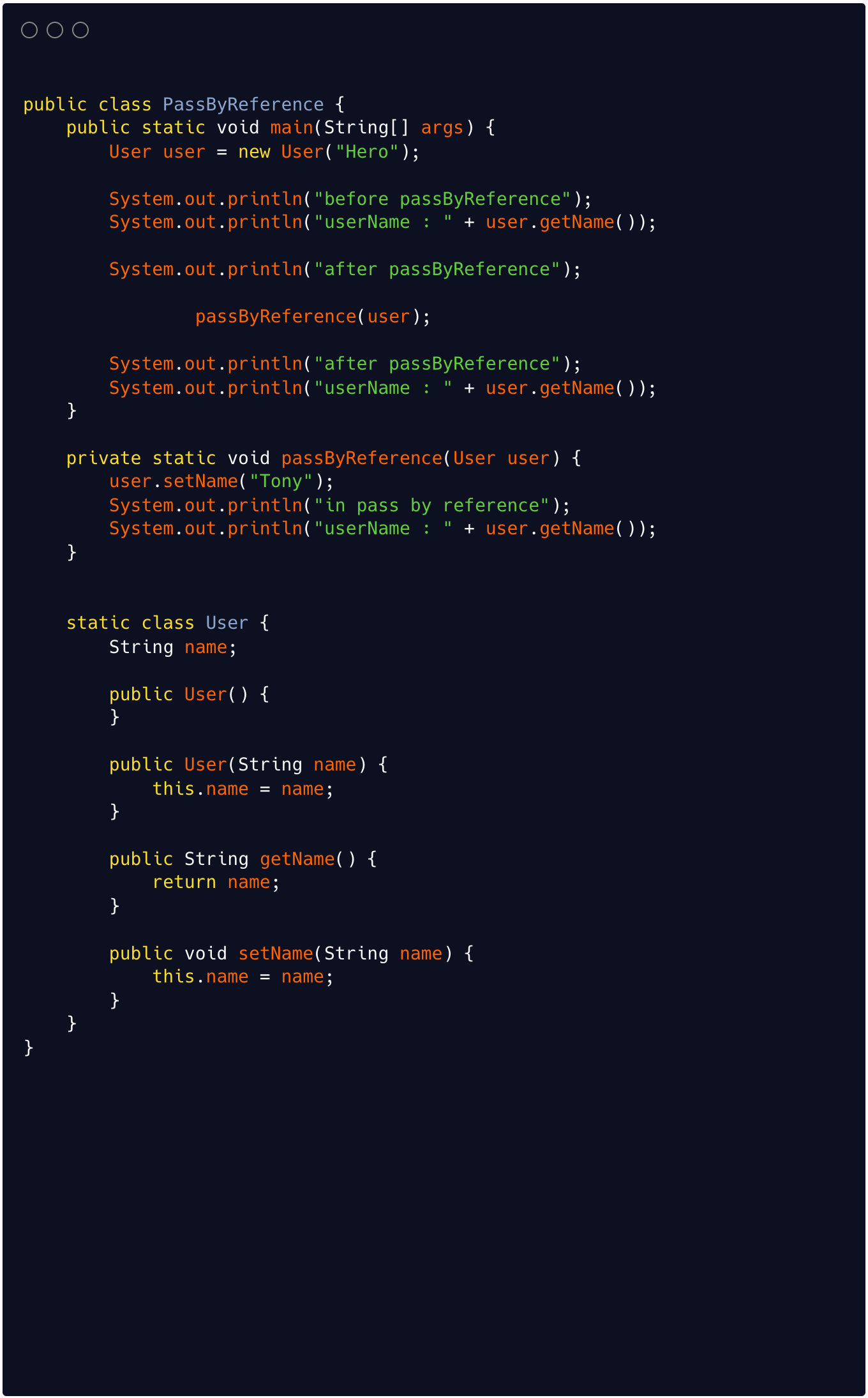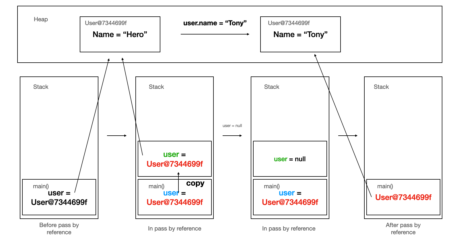 처음 main() 에서 User 를 만든 이후 그 주소 값을 매개 변수로 전달하여 passByReference() 내부에서 변경된 User 의 변화가 main() 에도 영향을 미친다. 이와 같이 변수의 주소 값으로 전달하는 것을 ‘Pass By Reference’ 라고 한다