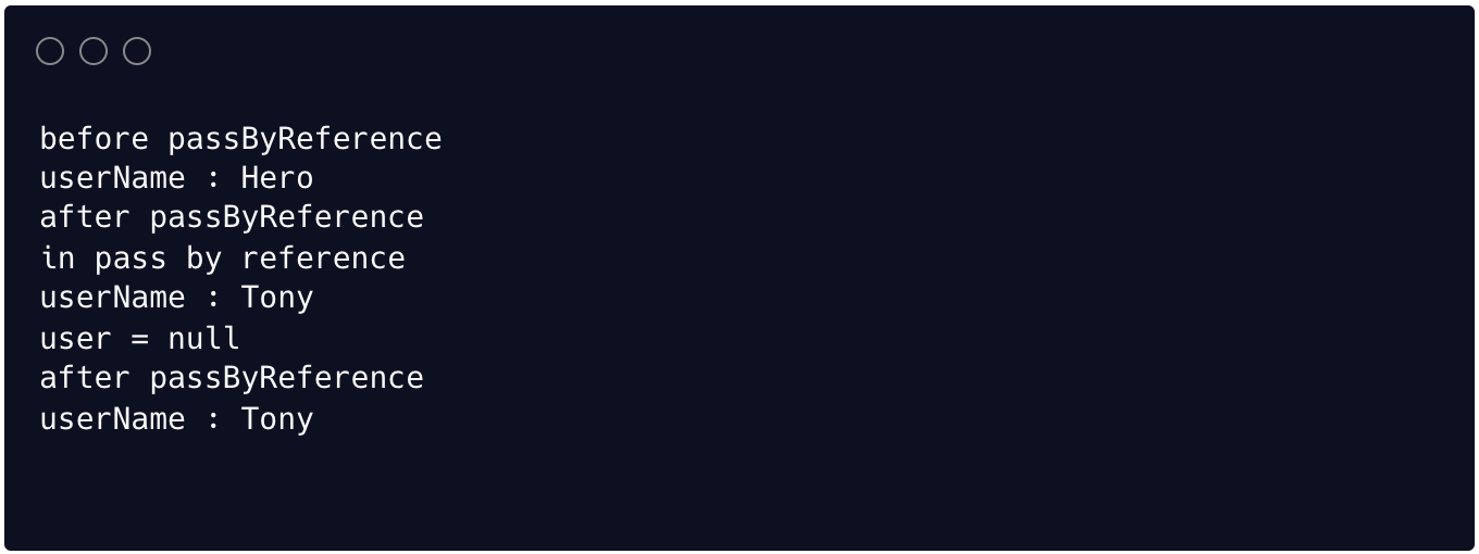 예제 코드를 살펴보고 가장 의문인 지점은 user = null 일 것이다. 분명 참조로 전달했을 때는 카피본의 변경이 원본에 영향을 미친다고 했음에도 불구하고 결과 값은 userName : Tony 로 NullPointException 이 발생하지 않았다. 이를 통해 자바에서 ‘Pass By Reference’는 주소의 위치 값을 새로운 변수에 복사한다는 사실을 알 수 있다. 위 내용이 자바에서 Pass By Value 만을 제공한다고 얘기하는 이유이다.