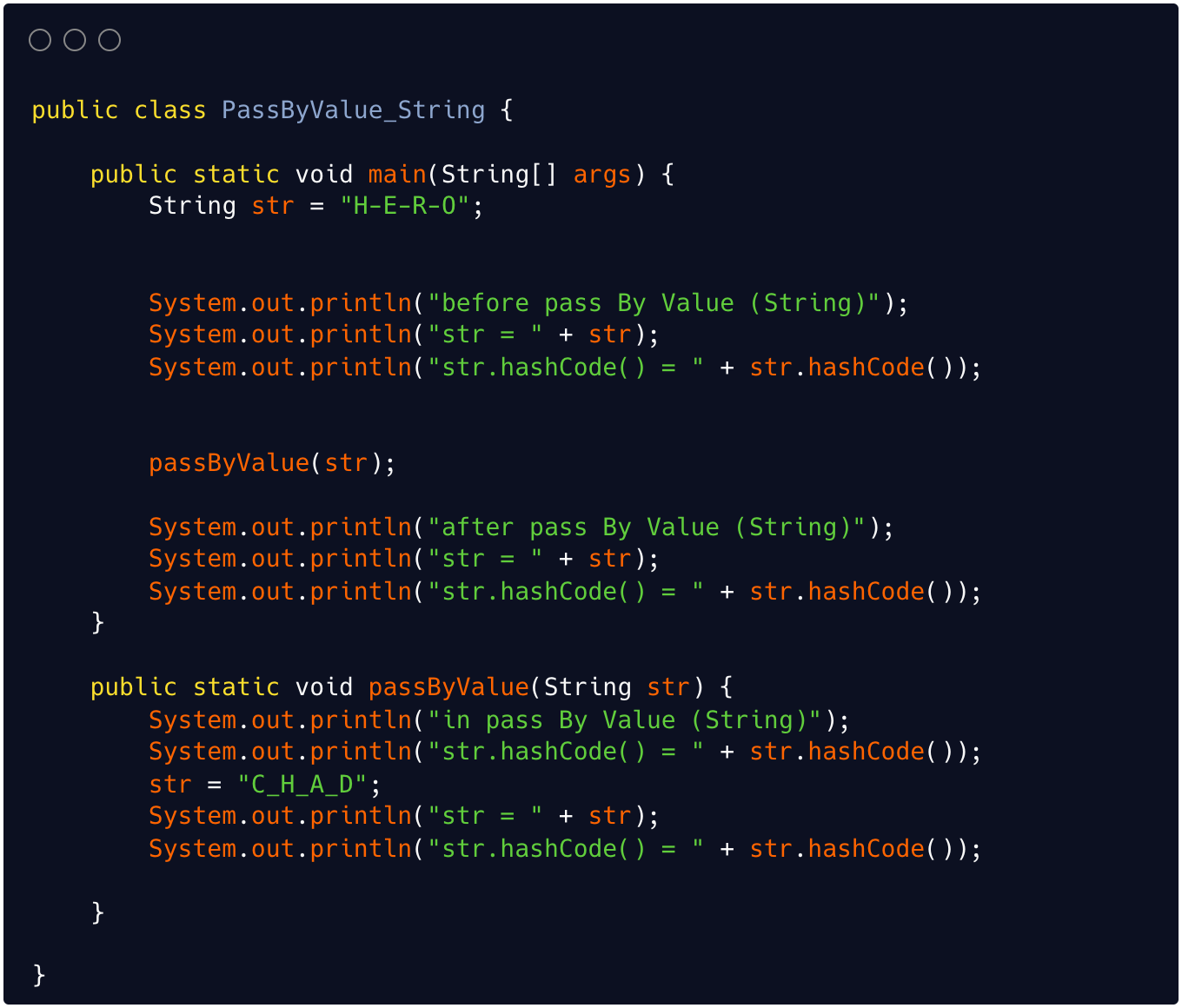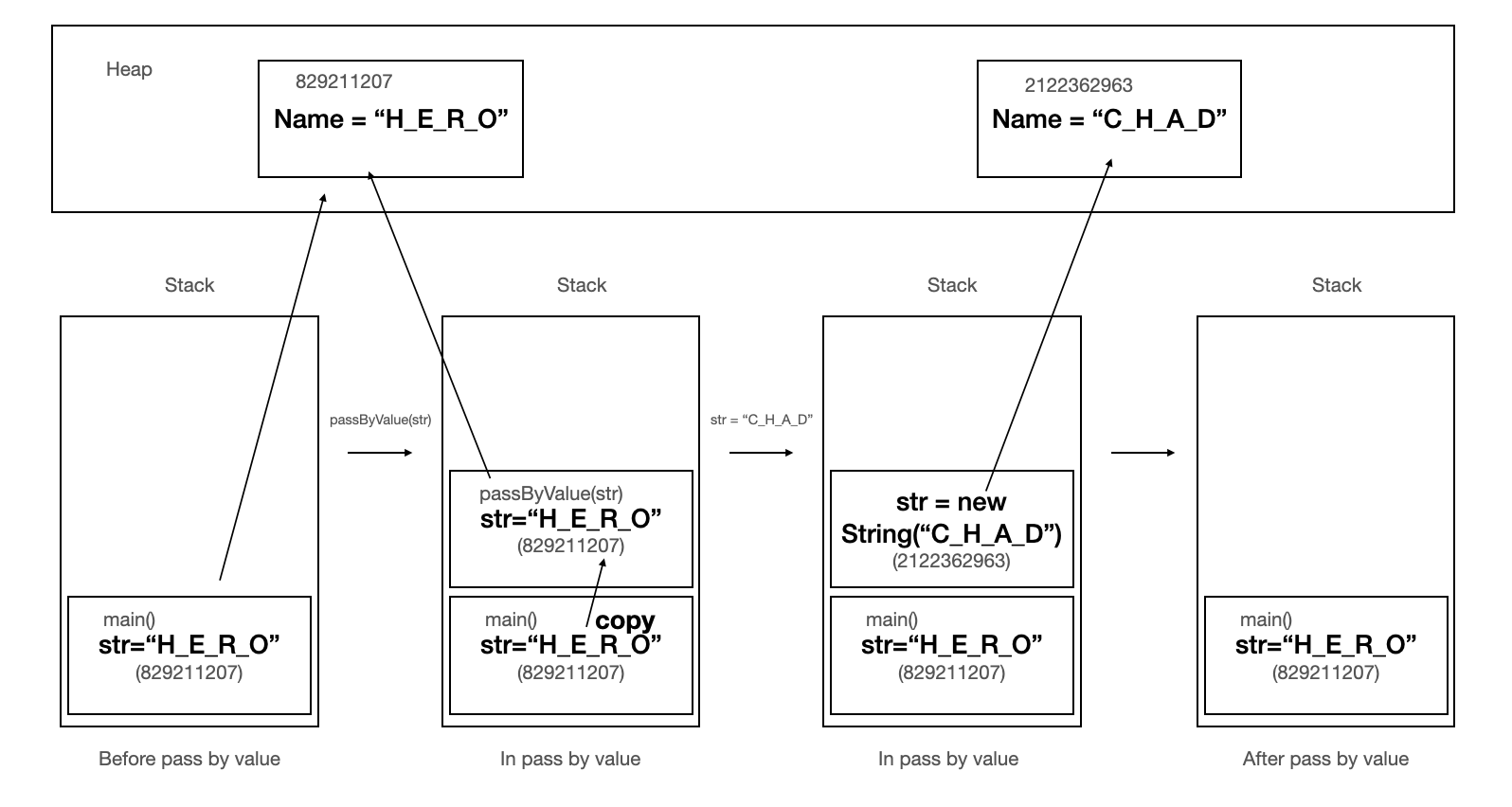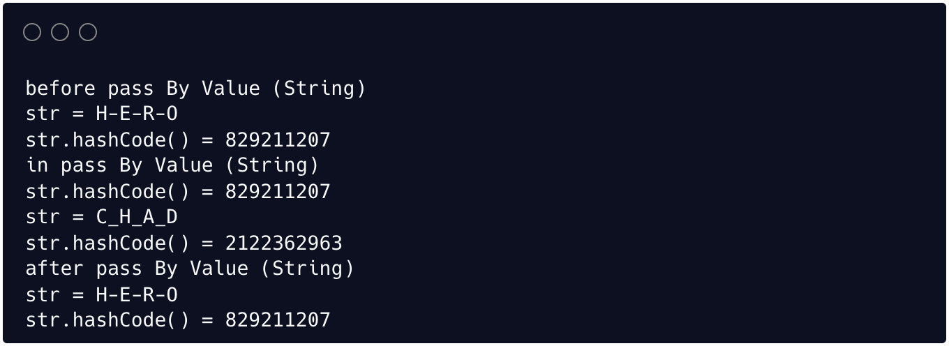 예제와 결과 값을 확인해 보니, ‘before pass By Value (String)’에 str 의 주소 값과 ‘in pass By Value (String)’의 str의 주소 값은 같다. 다만, str = "C_H_A_D" 이후 서로 주소 값이 달라졌다.