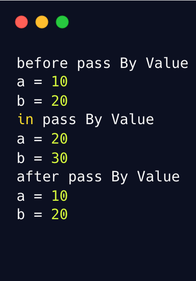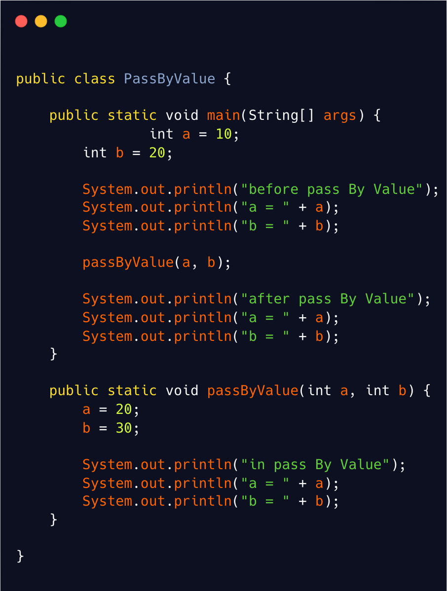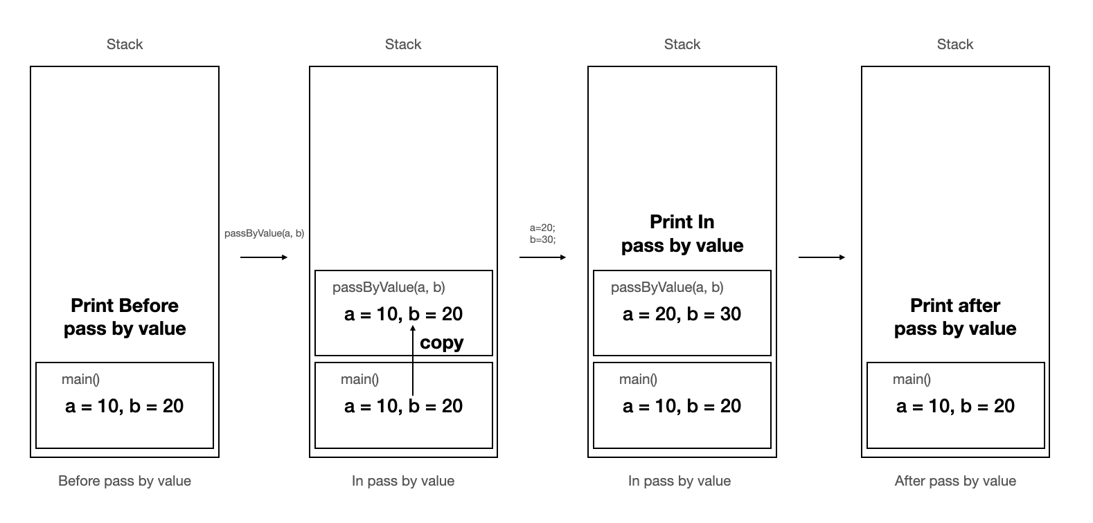 예제 코드에서 확인해보면 passByValue(int a, int b) 내부에서 매개 변수로 전달된 a, b 를 변경했음 에도 main() 로 돌아온 이후 a, b 의 값에는 변화가 없었다. 이와 같이 매개 변수로 전달할 때 값을 복사해서 전달하여 서로 영향을 미치지 않도록 하는 것을 ‘Pass By Value’ 라고 한다.