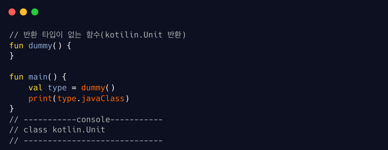 반환 타입이 없는 경우 Unit Type이 반환된다. ( 자바의 Void 타입으로 이해할 수 있다. )