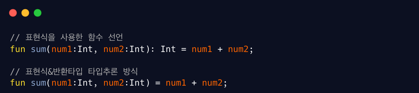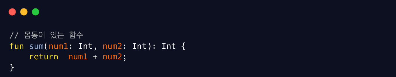 - fun 키워드를 사용한 몸통이 있는 함수.