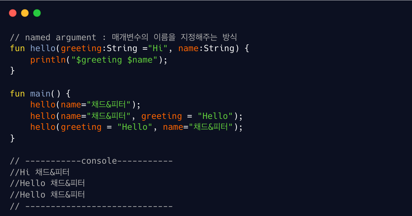 - 기존 자바에서는, 파라미터의 순서가 중요했다. 코틀린의 경우 이러한 파라미터 이름을 직접 지정하여 순서와 상관 없이 사용할 수 있도록 하여 가독성을 높였다.