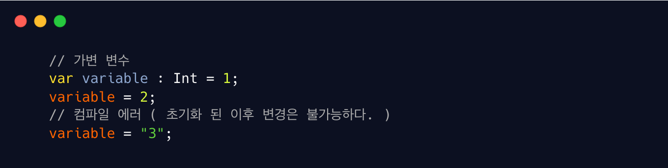 - 값을 변경하는 것은 가능 하지만, 동적타입 언어(ex. JavaScript, Python )처럼 한 번 초기화된 타입이 아닌 타입으로 변경하는 것은 불가능하다.