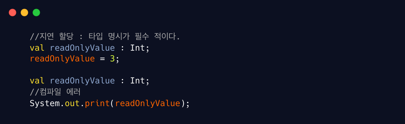- 지연 할당이 가능하다. 즉, 초기화 하지 않은 상태로 변수 선언이 가능하다. 하지만 사용 전에는 초기화 해주지 않으면 컴파일 에러가 발생한다.