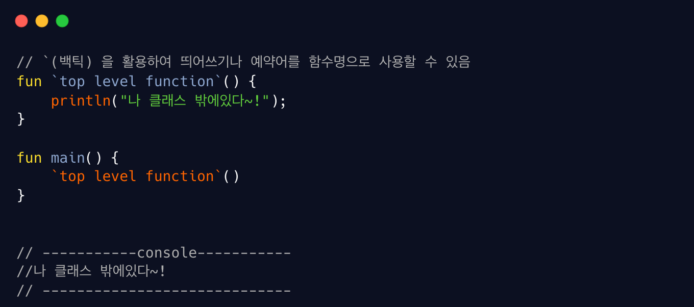 - 벡틱(`) 을 활용하면 함수명에 띄어쓰기 혹은 예약어를 포함할 수 있는데, 테스트 코드의 함수명으로 사용하면 가독성을 높일 수 있다.