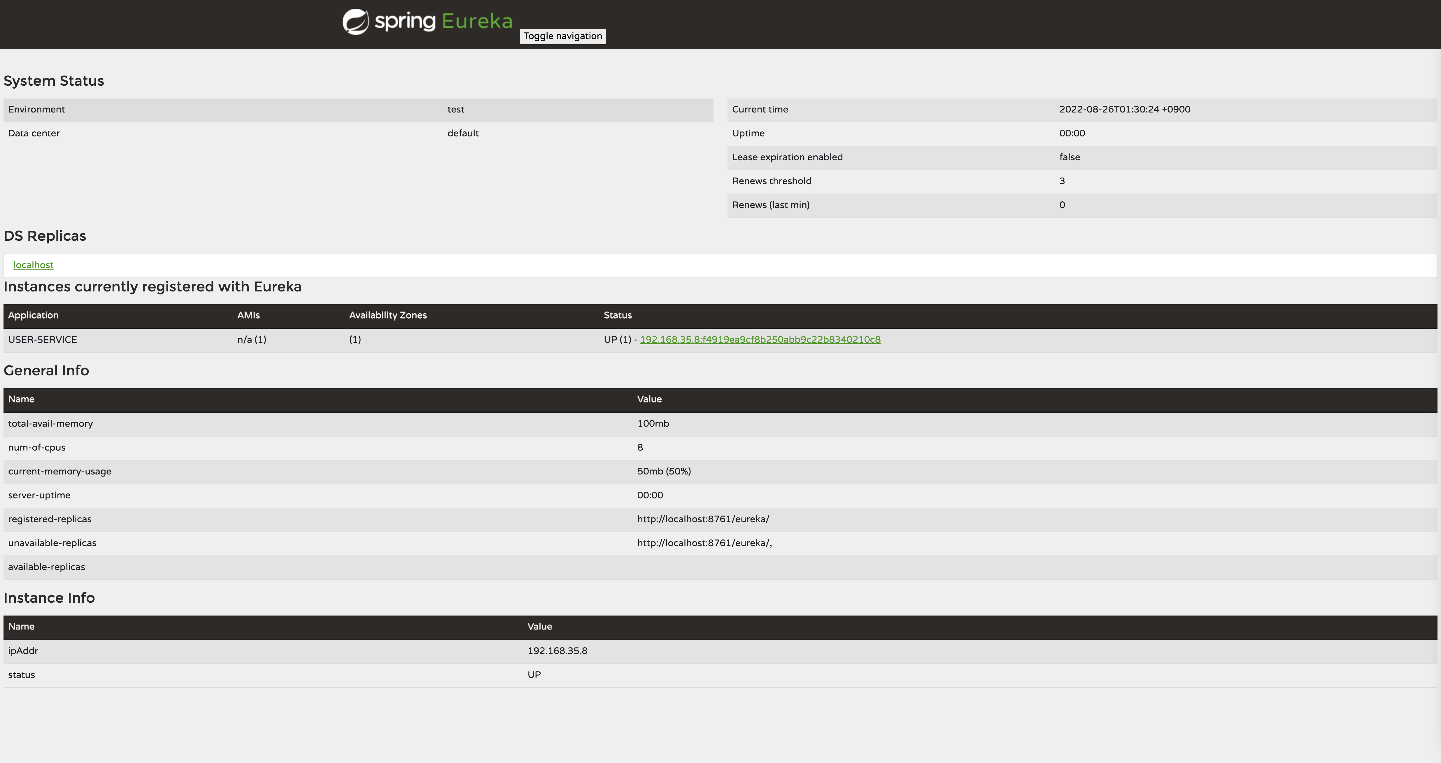 Instances Currently registered with Eureka 섹션을 통해 등록된 Eureka Client를 확인할 수 있다.