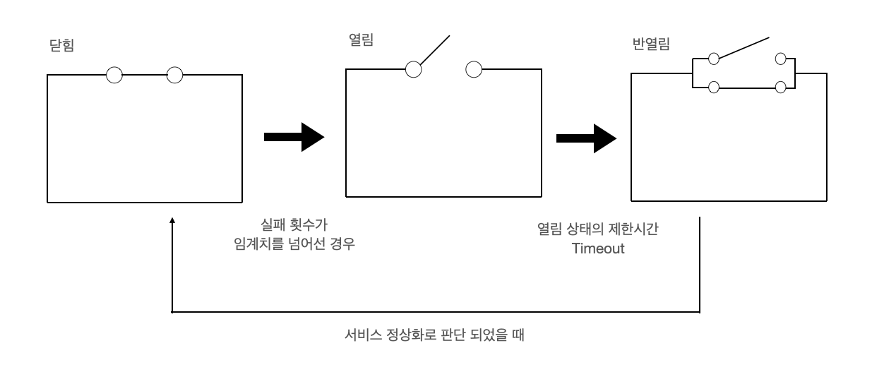 실무에서 서비스간 통신이 닫힌 상태에서 대체 로직으로 유도하는 fallback 패턴을 같이 사용한다.