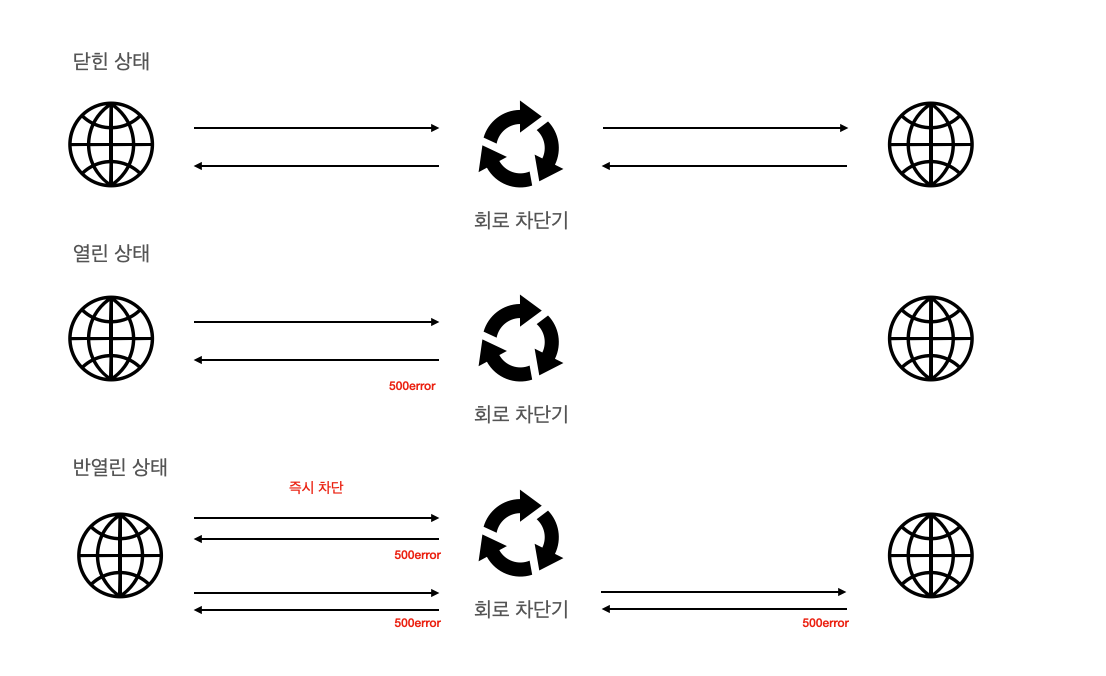 회로 차단기는 중간에서 프록시 역할을 하면서 애플리케이션 상태 모니터링 통해 실패할 가능성이 있는 애플리케이션인 경우 즉시 실패 시키거나 허용한다.