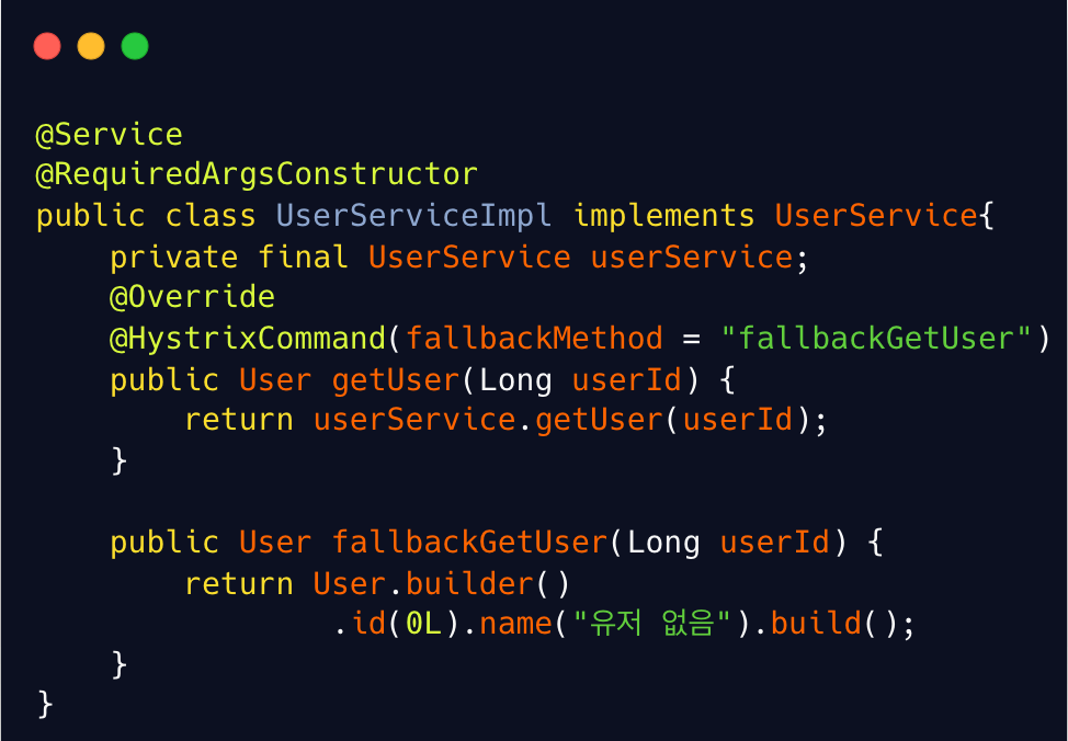 - @HystrixCommand( fallbackMethod = "methodName" ) 같은 방식으로 fallback Method를 지정함으로서 Circuit Breaker Pattern에 닫힘 상태과 되고 요청이 실패한 경우 회로 차단기에서 해당 요청을 가로채 fallBack Method를 실행하도록 유도한다.