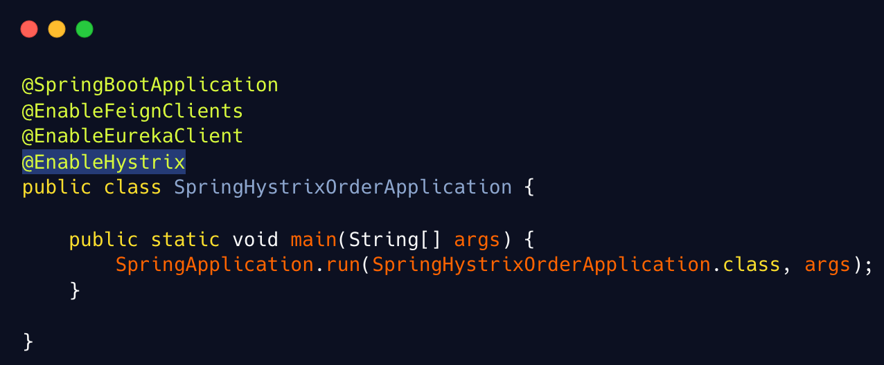 - @HystrixCommand 어노테이션을 통해 해당 메서드로 Hystrix를 통해 관리된 다는 것을 알린다.