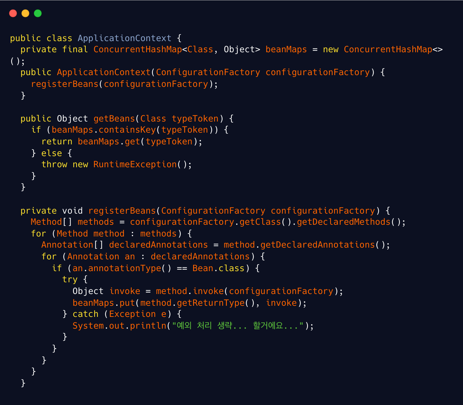 ﹖ 리플렉션을 통해 Custom Annotation( @Bean )을 마킹한 메서드들을 읽어와 맵에 등록한다.
