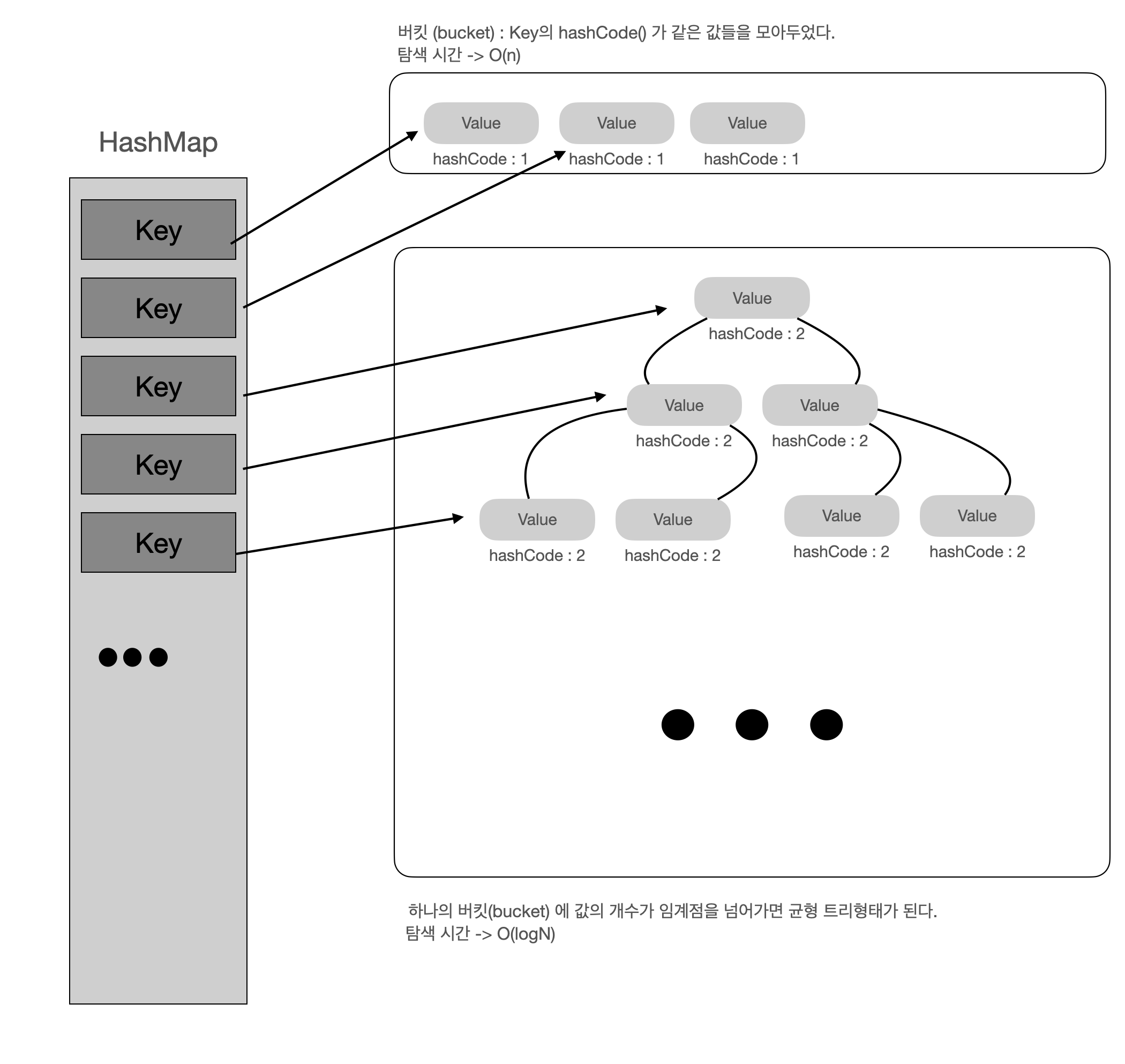 - 하나의 버킷의 값의 개수가 늘어나면 균형 트리 형태로 변경하여 이진 탐색을 진행하여 O(lonN) 의 시간 복잡도를 가지게 된다. 다만 값을 추가하거나 관리하는데 오버헤드가 발생할 수 있다.