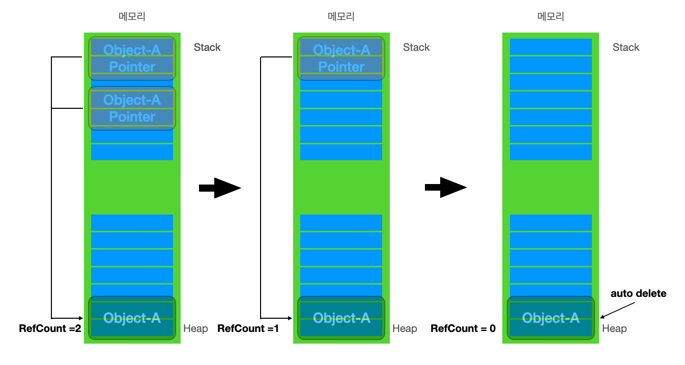 - Objective-C와 Swift 등에서 사용하는 참조 횟수 가비지 컬렉터에서 제공해주는 방식으로, 참조 횟수를 체크하여 참조 횟수가 0이 되었을 때 해당 오브젝트를 소멸시키는 방식이다.