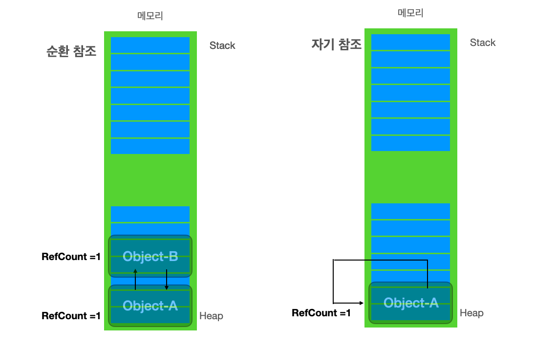 - 참조 횟수를 통해 소멸자를 호출한다는 의미는, 참조 횟수가 0이 되지 않는다면 메모리가 해제되지 않는다는 것을 의미한다. 이 때 문제가 발생할 수 있는데 스스로를 참조하거나 순환 참조가 발생할 때는 소멸자 호출이 되지 않기 때문에 메모리 누수가 발생한다.