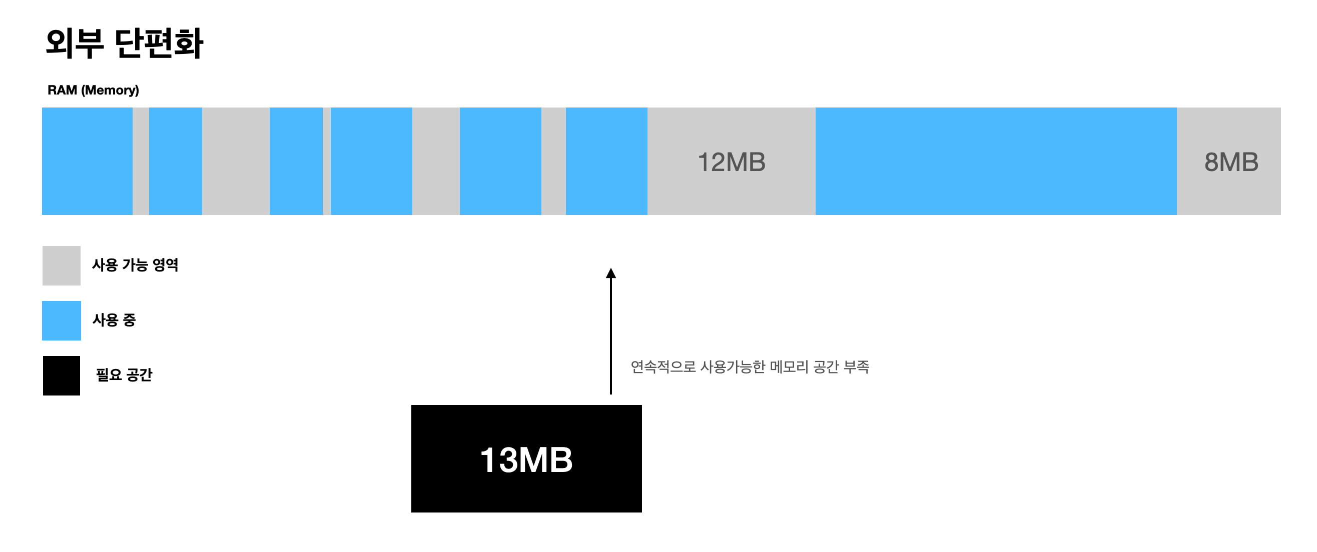 - 메모리 사용 공간이 충분함에도 메모리 할당이 불가능